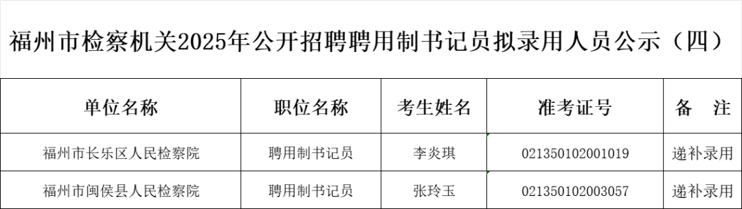 附:福州市检察机关2025年公开招聘聘用制书记员拟录用人员公示(四)